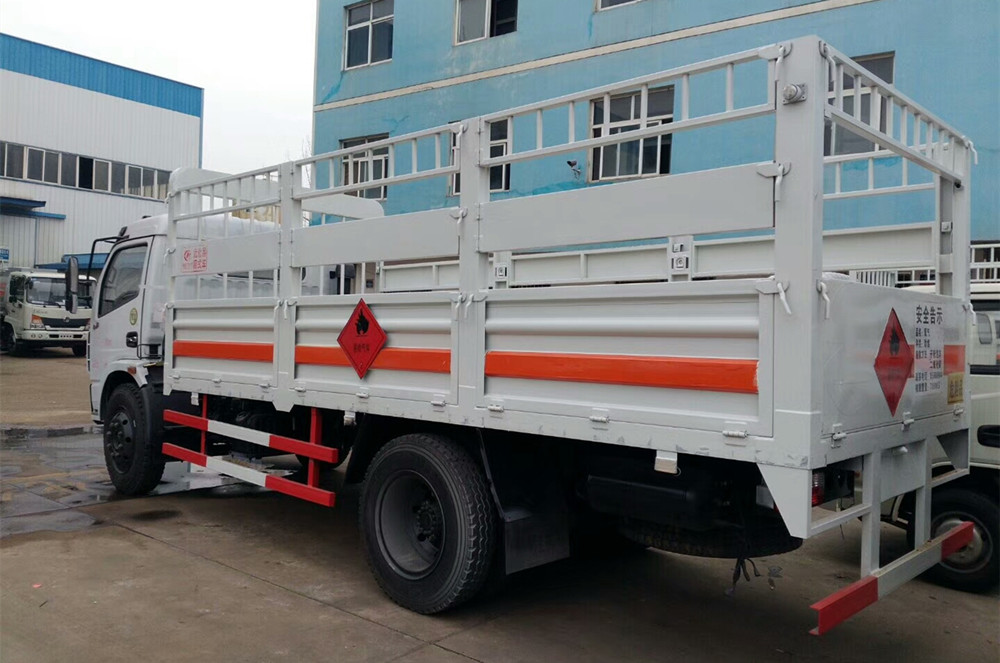該車適用于運輸危險品。用于運輸具有**容器(瓶)包裝的易燃氣體(類項號:2.1):液化石油氣,壓縮甲烷或甲烷含量高的壓縮天然氣,乙炔,乙烷,丁烷,丙烯,丁烯,二甲醚,壓縮氧;用于運輸具有**容器(瓶)包裝的非易燃無毒氣體(類項號:2.2):二氧化碳,壓縮氧(氮,空氣,氦,氬,氖)。防護材料:Q23**碳鋼,連接方式:左右側(cè)面及后部防護均采用焊接連接,后部防護斷面尺(mm):**×50, 后部防護離地高度(mm):500。僅采用底盤子午線輪胎和帶ABS的底盤,該車前輪安裝盤式制動器,前置排氣管,裝配限速裝置,限速80km/h。安裝帶有衛(wèi)星定位功能的行駛記錄儀。ABS系統(tǒng)生產(chǎn)廠家及型號:襄陽東風隆誠機械有限責任公司,ABS/ASR-24V-4S/4M。隨底盤選裝前面罩,前保險杠,前組合燈具。上裝可選裝無柵欄。后部液壓尾板收起狀態(tài)的水平長度是250mm。危險貨物運輸車輛的車輛類型(FL型車輛)。